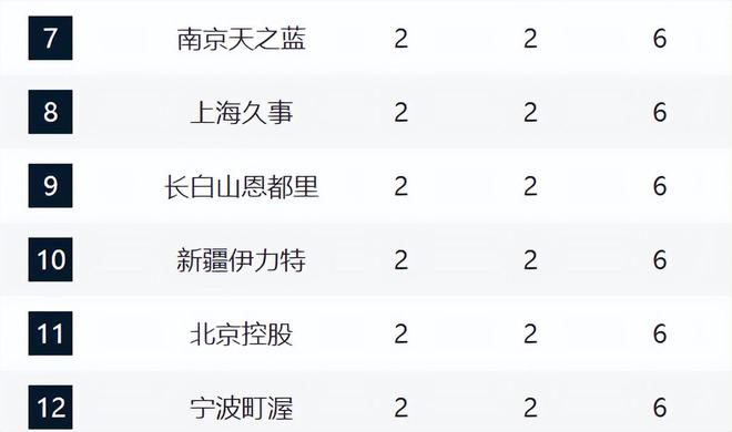 7-12分别是同曦、上海、吉林、新疆、北控和宁波。同曦这四场赢了上海和四川,但目前阵容还是劣势,不知道能不能稳住前12。上海的卢伟成为了球队的困境,现在他的执教一塌糊涂,这对于他们是隐患。吉林则连续拿下天津和新疆,彰显球队的韧劲。新疆也是教练组的问题,用人不行,攻守都存在弊端。北控在张庆鹏的防守下没有防守,沈梓捷和邹雨宸还受伤了。宁波今夏招兵买马,目前排在第12,算是奇兵球队了。